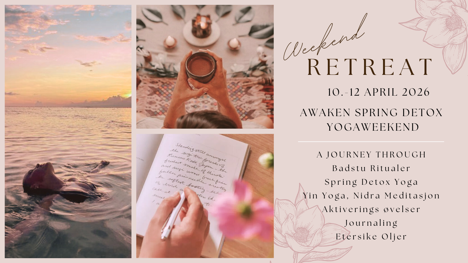 Dette er en helg for deg som lengter etter: ✨ en ny start ✨ mer energi, livsgnist og klarhet ✨ å slippe vinterens tyngde ✨ ritualer som støtter både kropp og sinn ✨ å lande i deg selv – og løfte deg selv Vårens energi – Detox, fornyelse og aktivering Våren symboliserer håp, vekst og nye muligheter. Dette er tiden for å riste av seg vinterens stagnasjon og invitere mer flyt og vitalitet inn i både kropp og sinn. Alt i naturen våkner – og denne helgen får du lov til å gjøre det samme.